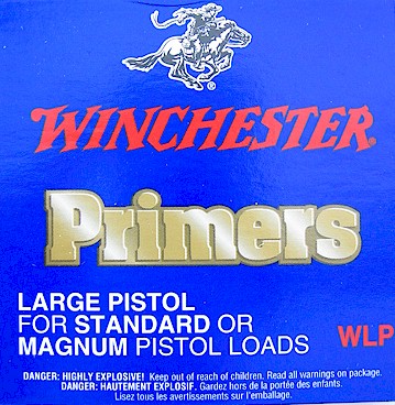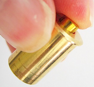 You have first to insert a primer cap into the primer pocket of the cartridge. The primer must be of the large pistol type as the Winchester reference shown above.