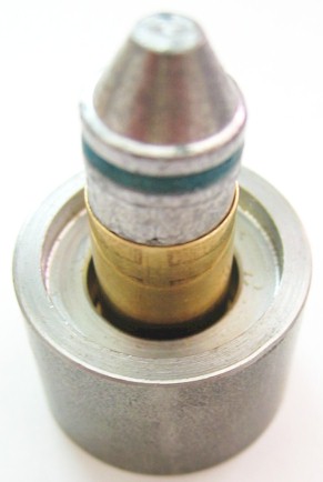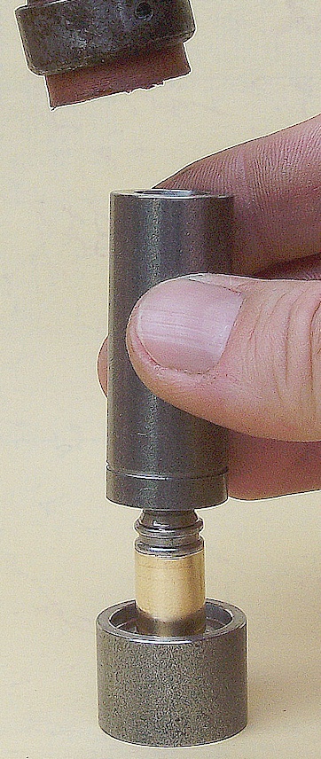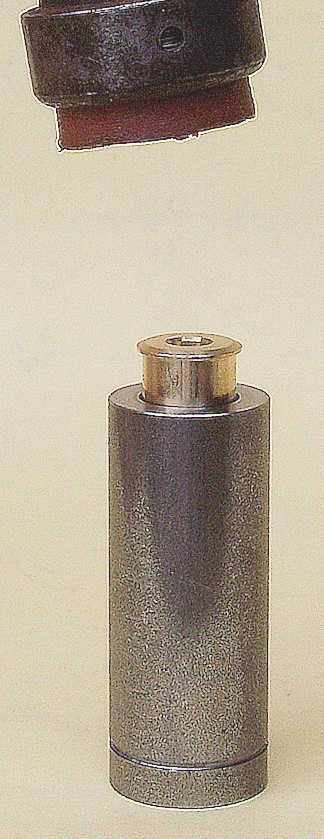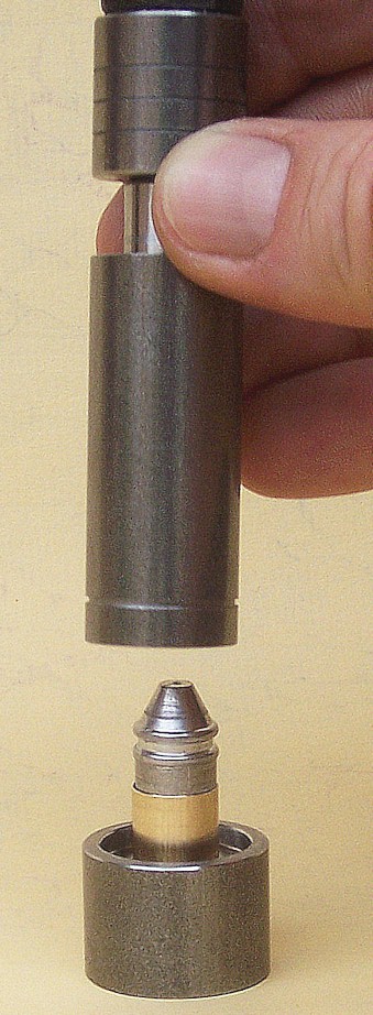 Pushing tool 3 - Put the case on the basement as shown above, and start the seating of the bullet manually. Be sure that the bullet is perfectly aligned with the case mouth in order to avoid any lack of verticality that would become very difficult to compensate later. Then place the crimper block, and pushing tool, over the cartridge. The external groove of the crimper tool must be below. Let the crimper block assembly slide down until it is stopped by the basement.