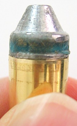5 - The last action is the crimping of the case mouth. Place the washers inside the basement before putting the cartridge case on them. Let the crimper tool go down (with the external groove below), and push it with a mallet (you can also use a vise) until the crimper's face reaches the basement. Just add some wax-grease mixture in the bullet lubricating groove before using it. Bullet lubrication is essential to reduce bore leading.