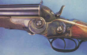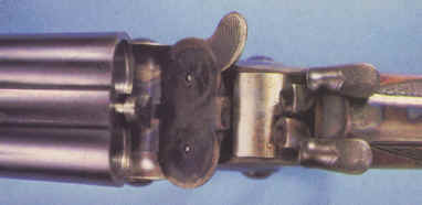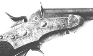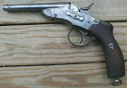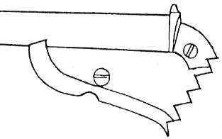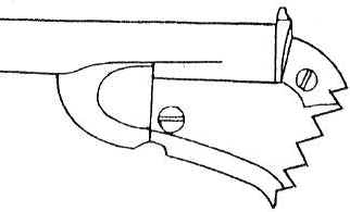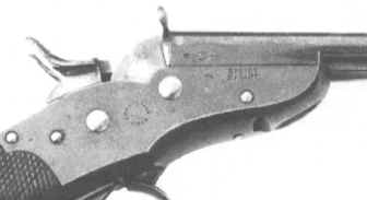By 1877, a very special - in terms of shape - double-barrelled handgun, including a "rolling block" lock was produced. This weapon was to become the very first metallic cartridge handgun to be accepted by the Belgian Government to equip its Gendarmerie. This quite rare weapon (no more than some 2,000 were built) was kept in service until 1901 when it was replaced by the FN Browning 1900 auto pistol. The pistol was sold on the commercial market until 1910. The cartridge, of 9.4 mm caliber, was created by Bachmann, a Belgian manufacturer. This cartridge is known under the names : 9 mm Belgian or 9.4 mm Nagant. The lead bullet of 12 grams weight was paper patched and inserted into a 22 mm rimmed case with a slight taper. The charge was of 1 gram of very fine black powder (hunting quality) that allowed for a 197 m/s muzzle velocity. Two types of the model 1877 pistol can be found. The first series (until serial number 1050) was built with a two-part receiver as shown on the drawing on the left. After the first series, a one part receiver was used as shown in the second drawing. The exact quantity produced is unknown, but we can estimate it at about 2,000 pieces. These handguns are therefore very rare to find and costly. When replaced by the Belgian Government, these pistols were sold as military surplus to specialized firms. Many were bought by American companies like Bannerman. First type Second type